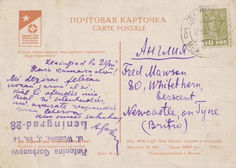 Fred Mawson, from Cowgate in Newcastle upon Tyne, was a proud member of the National Clarion Cycling Club. His archive includes photographs of socialist cycling meets from the 1920s and ’30s, striking architectural shots, and, perhaps most intriguing, his Esperanto postcard correspondence with pen friends across Eastern Europe.
