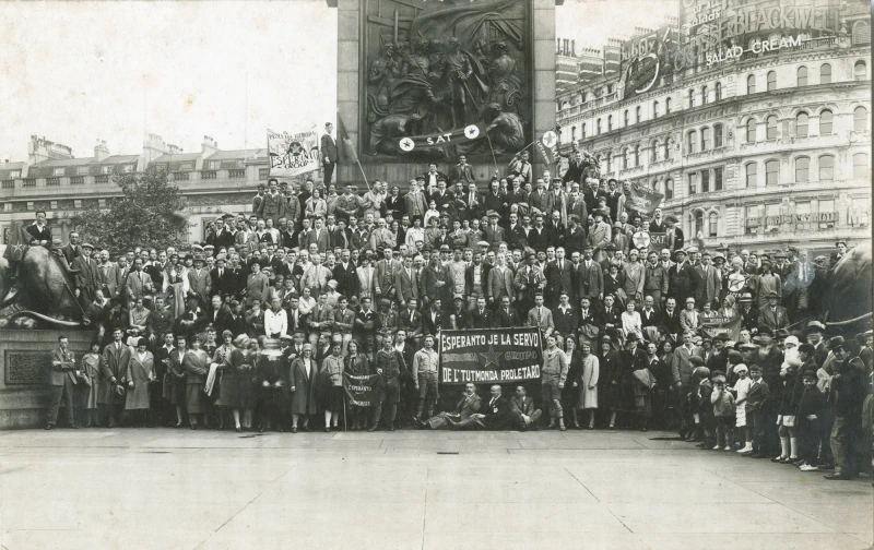 Trafalgar Square gatherings in the 1930s, the Verda Stelo badge pinned proudly to lapels.